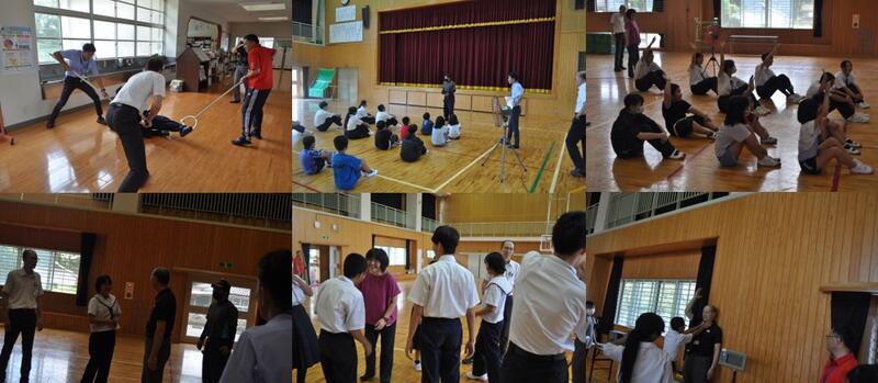 不審者が制止を振り切って、児童生徒のいる教室へ向かい、先生方がさすまた等で不審者を抑え込む間に、児童生徒は決められた場所に避難する流れでした。本校は毎年不審者対応の訓練を実施しており、「慣れているので行動が速いですね。」と評価していただきました。体育館では、不審者の見分け方、不審者に遭遇した時の対処の仕方、腕をつかまれた時の外し方について指導していただきました。また、先生方にも道具を使った、不審者の押さえ方、警察への通報などについて指導していただきました。