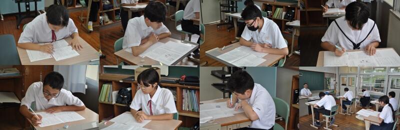 これまでの学習内容がテスト範囲で、当然定期テストより範囲は広くなります。ですから普段の学習が問われるわけですが、この夏休みにどれだけ学習に取り組んだかもその成果が問われます。生徒の反応は、「国語はまあまあ、理科は自信がある。」、「やばいです。」、「後のお楽しみです。」と様々でした。