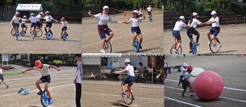 一輪車の練習は、全体の動き(フォーメーション)を確認した後、実際に一輪車に乗って動いてみたり、個人練習をしたりしました。1年生は中学生の補助などが必要ですが、自分にできることを一生懸命頑張って欲しいと思います。中学生も1年生や小学生のサポートをよくやってくれています。