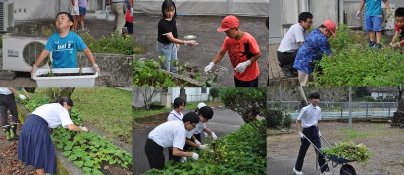 本校は、全児童生徒が「みどりの少年団」に所属しており、毎週木曜日はその活動日となっています。9月14日は、サツマイモ畑の除草作業に取り組みました。
