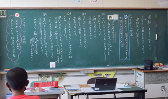 1年生3名、2年生1名の複式学級での授業で、学習のめあては1年生が「足し算カードの並び方のきまりを見つけよう。」、2年生が「7の段の九九をつくろう。」でした。複式学級の授業ですので、鍋倉先生にとっては2時間分の授業を一度にするようなものですから大変だったと思います。しかし、さすがベテランの匠の技というのでしょうか、そのような素振りも見せず指導されたのはさすがです。児童生徒も期待に応えるように、1年生は学び合いをしながら、2年生は自主的に学習に取り組み、それぞれのめあてを達成できたようです。