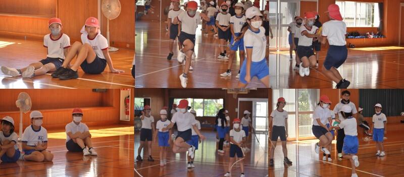 体育館で長縄跳びに挑戦しました。4つのグループに分かれ、自己紹介をして活動開始です。8の字跳び、交互の8の字跳び、長縄跳びしながらボールをパスするという難しい技にも挑戦しました。普段一緒に学習している児童ではないので、息が合わなかったり、個人差もあったりでうまくいかないこともありましたが、「惜しい」、「次できる」などを励ましの言葉をかけながら楽しく活動していました。