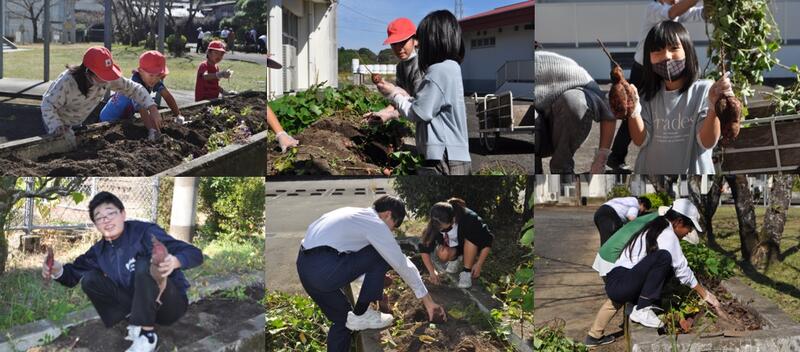 植えていた花壇(畑?)は3ヶ所で、小学生が1ヶ所、中学生が2ヶ所を分担しました。特に小学生の低学年は要領がわからず、土遊び的な活動も見られましたが、上級生や中学生と一緒に時間いっぱい頑張りました。やや昨年より多くのサツマイモが収穫できたようです。収穫したサツマイモは山分けということで、児童生徒全員が2、3個ずつ持ち帰りました。各家庭で調理して、おいしく食べることでしょう。