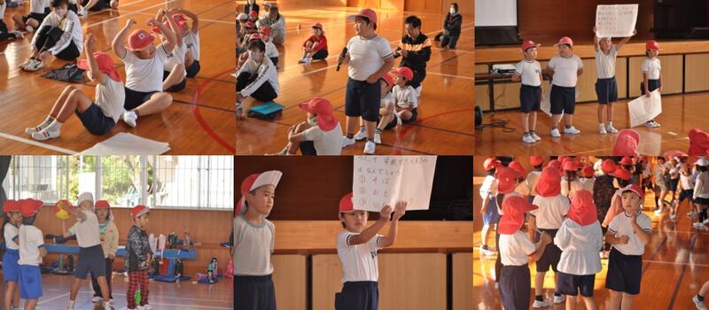 11月7日(火)、本校を含め高崎町内の高崎小学校、縄瀬小学校、江平小学校、高崎麓小学校の5校の1,2年生が高崎小学校に集まって、TZ学習を行いました。高崎小学校はともかく、その他の小学校にとっては小規模校であるため、大人数で学習する貴重な経験となりました。
