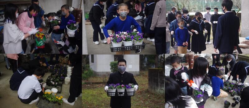 全校生徒全員で仕事を分担して、作業を頑張りました。残りの日数があまりなくて、どれだけ大きくなるか心配です。また、ビオラもパンジーも寒さや乾燥には比較的強く、育てやすい花ですが、水やりまでしっかりやって、大事に育てていきましょう。
