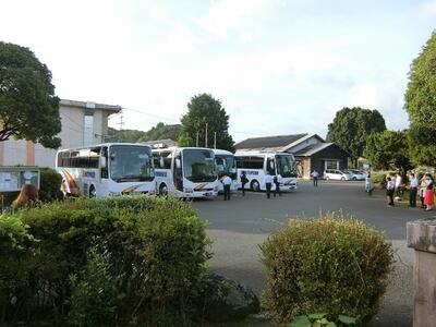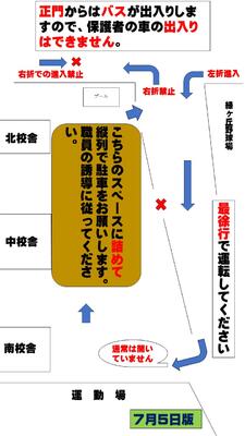 明日、7月5日(金)につきましては修学旅行生のバスが学校に戻ってくる時間と部活動終了の時間が重複しております。校内への車の乗入れにつきましてはお控えください。やむを得ず、迎え等で来校される場合は東門側でお待ちください。その際は、2学年の迎えの車の妨げにならないようにご配慮ください。お子さんにもその旨を確実に伝えてくださいますようお願いいたします。混雑・事故等を避けるための対応ですのでご理解のうえ、ご協力をお願いいたします。