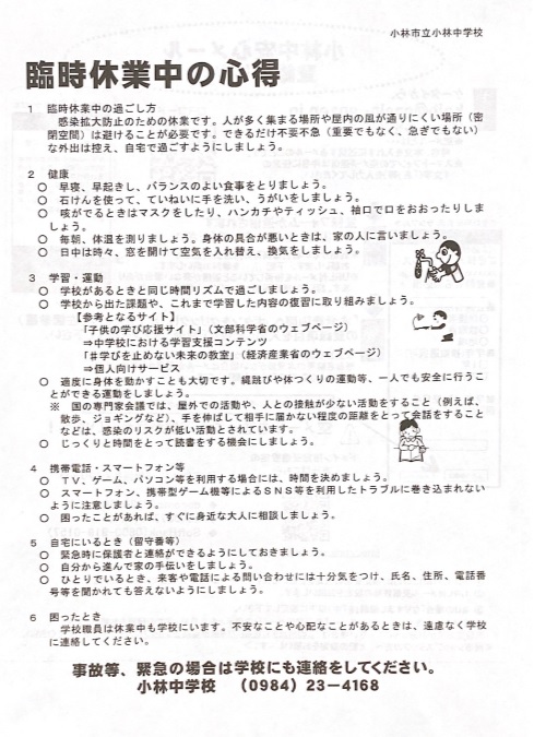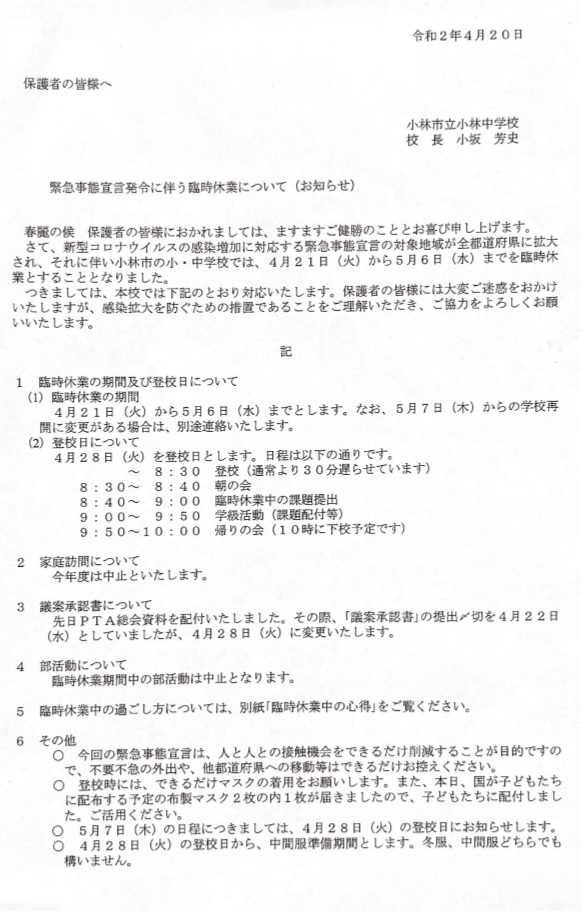 新型コロナウィルスの感染増加に対応する緊急事態宣言の対象地域が全都道府県に拡大され、それに伴い小林市の小・中学校では、4月21日(火)から5月6日(水)までを臨時休業とすることになりました。