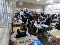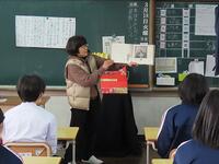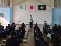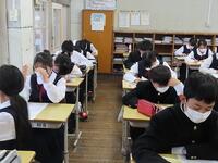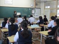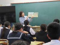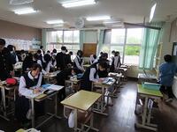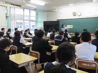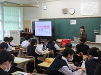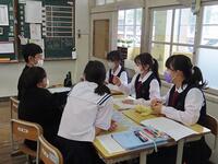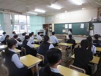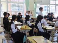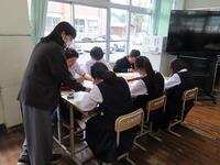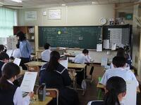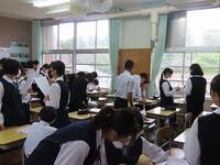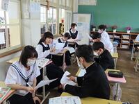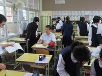 本日3時間目の授業の様子です。1年生は社会で地図帳を使って世界の国々を探す学習をしていました。2年生は体育でリレー競技でのバトンパスの練習をしていました。3年A組は美術で10年後の自分の顔を描く活動に取り組み、3年B組は英語でグループでの活動に取り組んでいました。