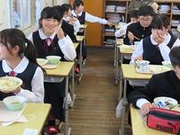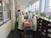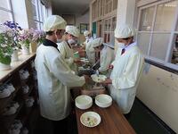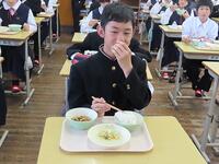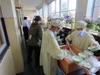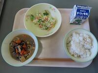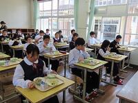 今日の給食は、「麦ごはん・牛乳・大豆の磯煮・ささみサラダ」です。1年生も随分配膳に慣れてきてスムーズに準備を進めています。ご飯をおかわりする生徒、おかずを減らす生徒、食べる量も実に様々です。必要な栄養をしっかり取って健康な体を作りましょう。給食センターの皆様、いつもおいしい給食をありがとうございます。