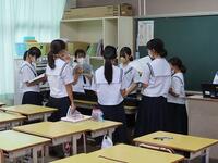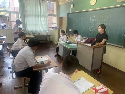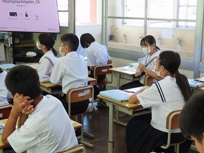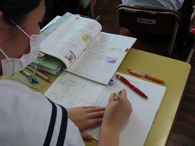 1年生の教室をのぞいてみると数学の授業を行っていました。方程式の学習を終え、この時間は「比が等しい関係と比例式について学ぼう」という目標が立てられていました。比については小学校で学習済みですが、中学校ではさらに深く学んでいきます。この学習が、次に学習する「関数」へとつながっていきます。和気あいあいとした雰囲気で授業が進んでいました。
