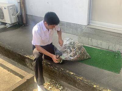 朝7時30分から、男子バレーボール部の生徒が竹ぼうきを手にボランティア作業を行い、男子ソフトテニス部の生徒はあいさつ運動を行っていました。一日の始まりです。生徒の皆さん、今日も楽しく学校生活を送りましょう。