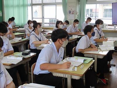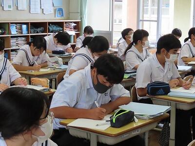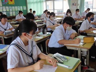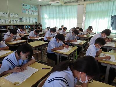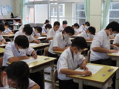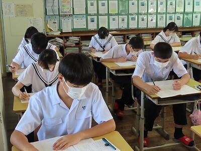 本日と明日にかけ、3年生第2回地区実力テストが行われます。今日は国語・理科・英語、明日は社会・数学が実施されます。写真は国語のテストを受けている様子です。今の自分の学力を知るための大切なテストです。3年生の健闘を祈ります。頑張ってください。