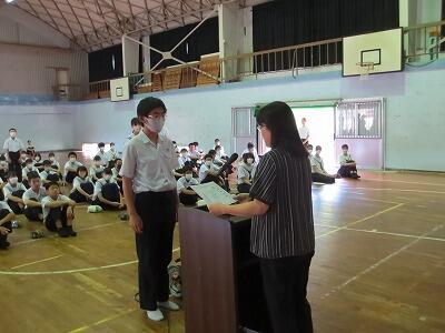 9月9日(月)の6時間目終了後、生徒集会を行いました。内容は、全校専門委員会の報告と文化発表会のスローガン説明、表彰でした。全校専門委員会の報告では、各全校専門委員長が具体的な取組事項についての説明を行いました。次に、文化発表会実行委員会によるスローガン発表です。今年度の文化発表会は、10月25日(金)の午後行いますが、スローガンは「個性全開~ぼくらの青春挑戦状~」です。素晴らしいスローガンに決まりました。文化発表会の成功を祈ります。また、表彰では、実用英語技能検定や日本漢字能力検定、ボランティア活動など多数の生徒が表彰されました。表彰された生徒の皆さん、おめでとうございます。今後も継続した取組に期待します。