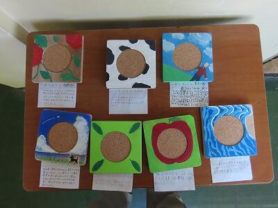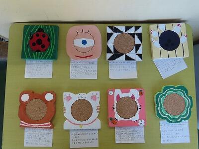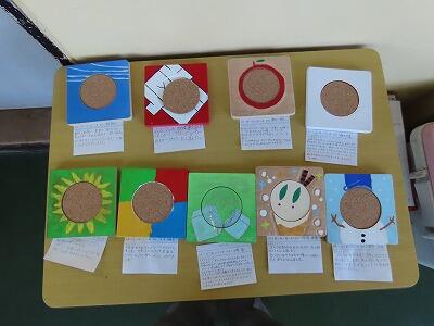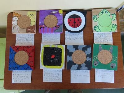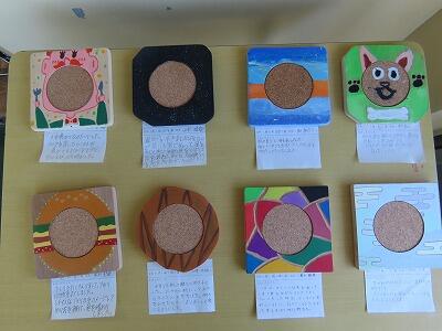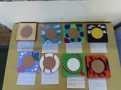 2年生の廊下に、美術作品が展示してあります。「コースター」です。様々な工夫を凝らした自分なりのコースターが作られていました。見ていて楽しくなる作品ばかりです。