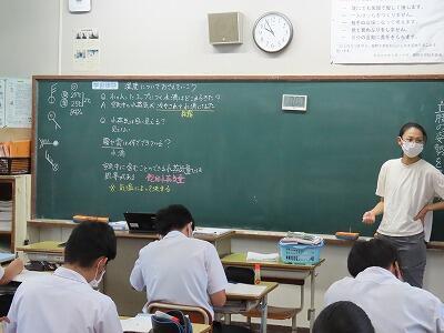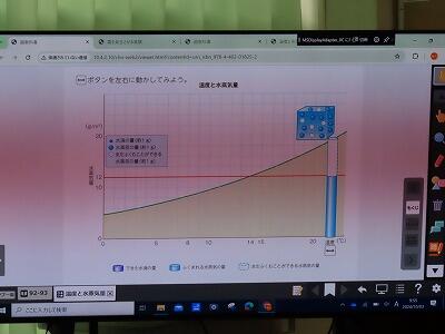 2年生の理科の授業の様子です。この日の学習課題は、「湿度についておさえていこう」です。「氷の入ったコップにつく水滴はどこからきた?」という問いから授業が始まりました。ICTも活用しながら子どもたちも真剣に授業に臨んでいました。