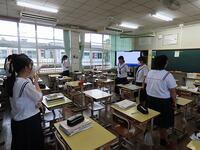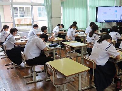 1年生の授業、英語と数学の様子です。英語では、辞書を使って単語調べの早さを競い合っていました。電子機器に頼らず紙の辞書を使って調べることも大切なことだと感じました。数学では、タブレットを使って「AIドリル」にチャレンジしていました。苦労しながらも楽しく活動することができていました。