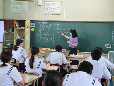 初めに小テストを5分程度行った後、授業に入っていきました。学習課題は、「いろいろな関数を学ぼう」です。二次関数の学習を終えた後に取り組む内容です。授業では、具体的な問題を解きながら、変域に用いる不等号の使い方について学ぶ姿が見られました。