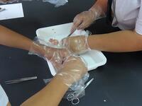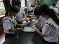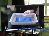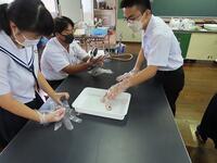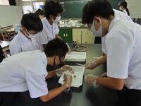 今日の学習課題は、「ブタの目を解剖して目のつくりを確認しよう」です。実際に用意されたブタの目をカッターとハサミを使って切り開いていきます。苦労しながらもなんとか切断することができ、虹彩・レンズ・網膜・視神経・盲点の観察を行いました。映像で見ることも大切ですが、実際に体験することで学びが深まると思います。