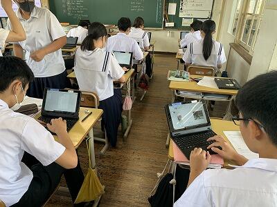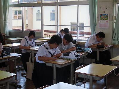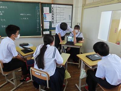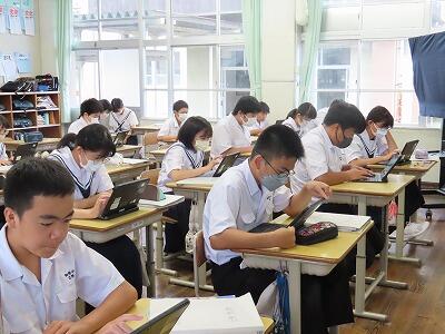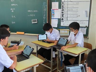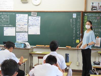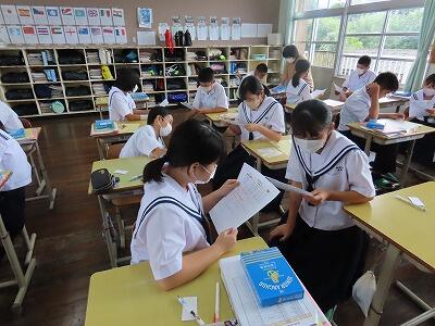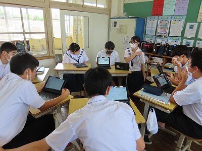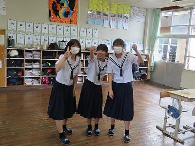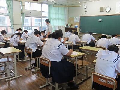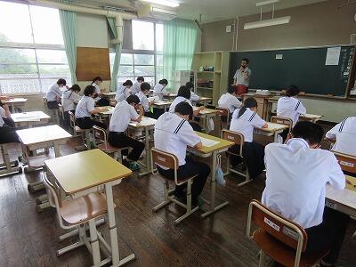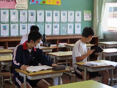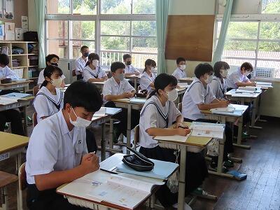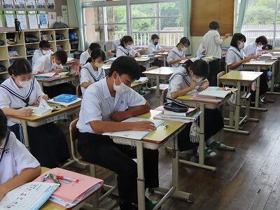 いよいよ夏休みが始まりました。3年生約10名が自主的に勉強するため登校していました。また、2年生も家庭科の授業の一環でミシンを使って裁縫に取り組んでいました。部活動は、男女ソフトテニス部、軟式野球部が暑さにも負けず練習に取り組んでいました。熱中症にはくれぐれも注意して活動を行ってほしいものです。