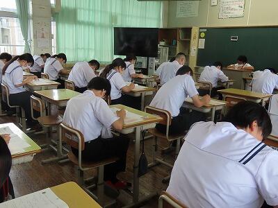 今日と明日で、3年生第1回地区実力テストが行われます。卒業後の進路選択の際にも利用する大切なテストです。今日は国語・理科・英語、明日は社会・数学のテストがあります。このテストは、今の自分の実力を知り、苦手な部分を克服するためのものです。頑張れ3年生!