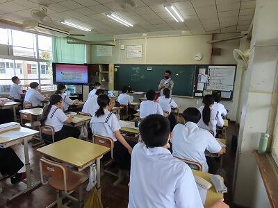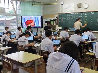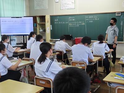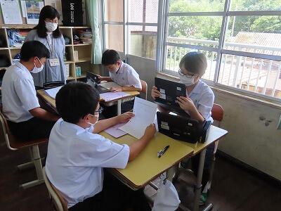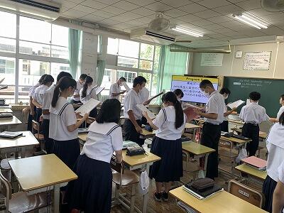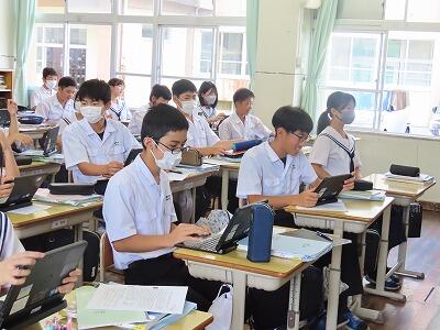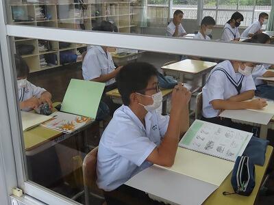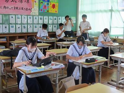 昨日梅雨明けが宣言されましたが、今日は朝から雨です。気分もやや落ち込みがちですが、子どもたちは元気よく授業に参加しています。1A美術、1B英語、2A理科、2B技術、3A社会、C組英語の授業の様子です。