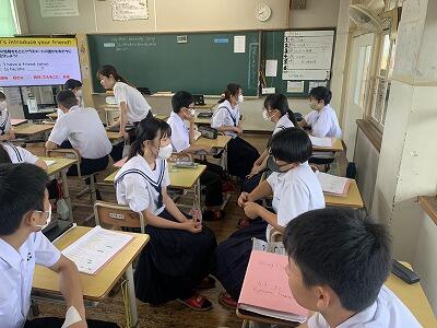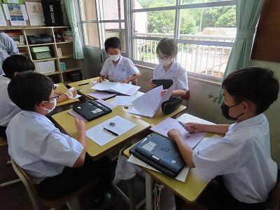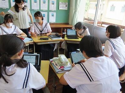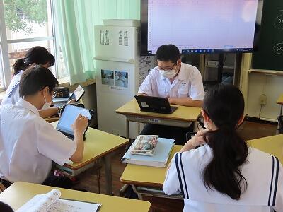 1年生の英語の授業の様子です。初めに新出単語の練習を繰り返し、その後辞書引き活動を行いました。どちらの活動もテンポがよく、子どもたちも集中して取り組んでいました。その後、本日の学習課題である「観光地で何ができるかを考え、相手に伝えよう」に取り組みました。What can we do in (観光地)?の質問に対して班ごとにタブレットを活用しながら回答文を作成します。班の数と同じ6つの観光地が示され、どの班も協力しながら活動していました。楽しそうに生き生き活動する様子が見られた授業でした。