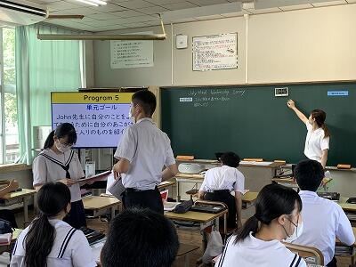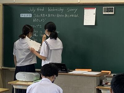 本日の英語の授業の目標は、「John先生や友だちにあこがれの人を紹介しよう」でした。会話練習をペアで行った後に、教師が示したあこがれの人の紹介をクイズ形式で聞き、それに答える形で授業が進んでいきました。その後、クラスメイトの紹介をペアで対話しながらそのやり取りを全体で共有しました。ここまで行った後に、本時の目標を達成するための活動に入りました。とても和気あいあいとした雰囲気で、教師の発問にも積極的に答える姿が見られました。さすが3年生だと思いました。今後、「学びの集団」として成長することを期待しています。