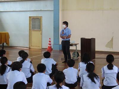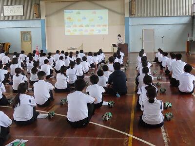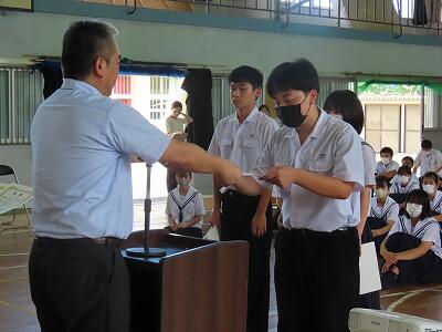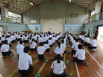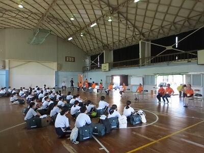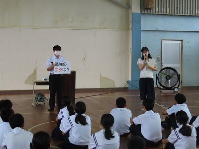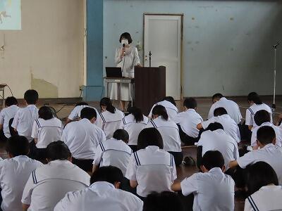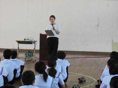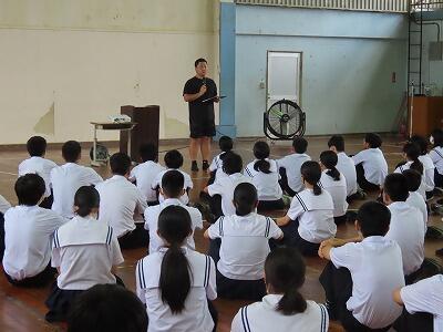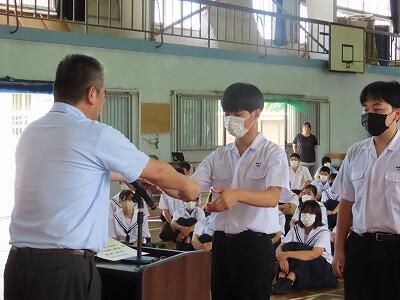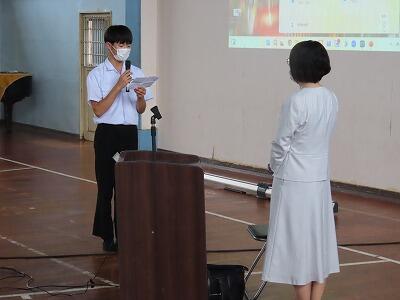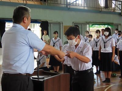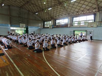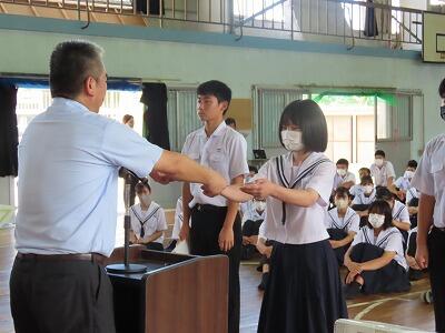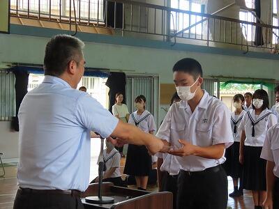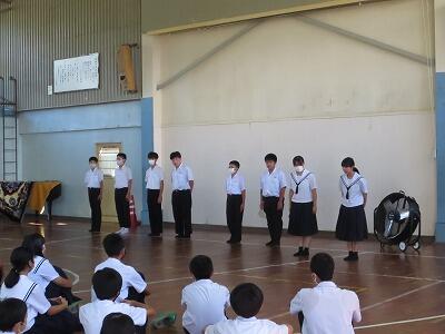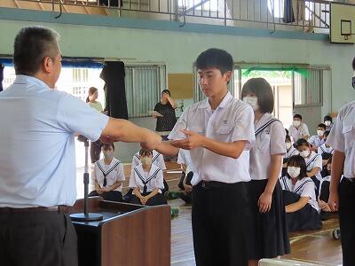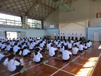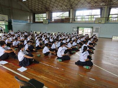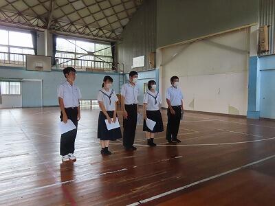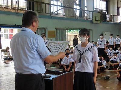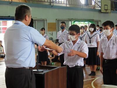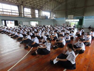 明日からいよいよ夏休みが始まります。夏休みを前に本日、「夏休み前集会」を行いました。夏休み中の過ごし方について、各担当より学習面、生活面、保健面について話をした後に、タブレットの持ち帰りについての指導も行いました。その後、選挙管理委員会よる生徒会役員選挙の説明があり、最後に表彰を行って集会を終えました。37日間、888時間の夏休み、一番大切なことは「命を守る」ことです。水難事故や交通事故には十分気を付けてほしいものです。124名全員が、充実した夏休みを過ごし、8月26日に元気よく登校してくれることを心から願っています。
