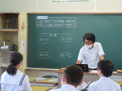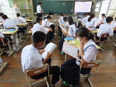 6月28日(金)の午後に生徒総会を行います。生徒総会での全校討議題は「時と場合に応じた言葉遣いやあいさつをよ良くするにはどうしたらいいか」です。討議題設定の理由を見てみると、「先生や友達に対してふさわしくない言葉を使う場面が見られる」「あいさつ日本一を目標に掲げているが、立ち止まってのあいさつや、大きな声でのあいさつは徹底できていない」と書かれてありました。現状に満足せず、さらにレベルアップしようという気持ちが感じられました。写真は、3年生の学級討議の様子です。本番でも活発な討議を期待します。