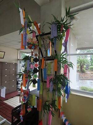 先日、小林地区更生保護女性会の方々より七夕飾りを寄贈していただきました。生徒会を中心に全校生徒で短冊を作成して飾りました。「家族全員楽しく生活できますように」「志望校に合格できますように」「宝くじ当たりたい(大金持ちになりたい)」「自分たちの望む学校にみんなが行けますように」「夏休みに美味しいものをたくさん食べられますように」「より多くの人が幸せに過ごせますように」など、様々な願い事が書かれていました。皆さんの願い事が叶いますように。