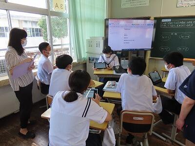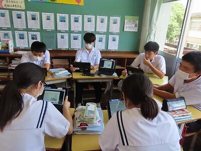 3年生の理科の授業です。単元名は「電池とイオン」です。本時の目標は、「金属イオンのなりやすさや電池について、多面的に調べる活動や他者の発表などを通して、学習内容が日常生活の様々な場面に生かされていることについて気付くとともに、次単元に向けて、自ら学習を調整しようとすることができる」です。生徒たちは、「これまでに学習してきた内容は、日常生活にどのように生かされているだろうか」という学習課題を解決するために、発表したり、発表に対して質問をしたりするなど理解を深めていました。発表内容は、「イオン化傾向」「リチウムイオン電池」「マグネシウム空気電池」「再生可能エネルギー」「結晶」「錆」などです。すべての生徒がタブレットを駆使して楽しそうに授業に臨んでいました。