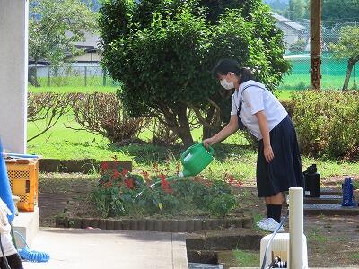 3年生の教室をのぞいてみると、10名の生徒が勉強を頑張っていました、家で一人で勉強するより、学校でみんなと勉強するほうが効率が良いとのことです。昔から、「夏を制する者は受験を制す」と言われます。夢の実現に向けて頑張りましょう。一方、体育館とグランドでは部活動に取り組む姿が見られました。暑さ指数を気にしながらこまめに水分を補給して部活動に取り組んでいました。また、勉強に来ていた3年生2人がボランティアで花の水やりをしている場面にも遭遇しました。良い気分転換になったことでしょう。