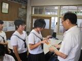 朝のあいさつ運動の列に候補者と応援責任者が並び、清き1票を訴えていました。給食時間の放送でも、立候補の理由や公約を、若干緊張気味に述べていました。