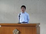 学年と生徒会の代表4名が2学期の抱負を発表しました。写真(左)は3年生。自分の短所の克服と入試に向けての決意を表明しました。原稿を読まないスピーチが定着しています。