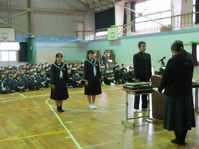 式では、代表生徒による修了証書授与の後、各学年・生徒会の代表があいさつを行いました。「周りを見て考えて行動したい」「何でも1番の細野中にしたい」「細野中の伝統を進化していきたい」など、本年度を振り返って、新年度の目標を堂々と述べてくれました。