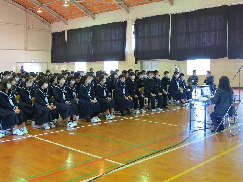 KDDIの方を講師に招き、SNSや携帯電話の使い方についてお話をしていただきました。「ケータイ・スマホは正しい使い方をすると便利なもの。使い方を間違えると危険なもの」というお話を、動画を交えながら分かりやすく説明していただき、生徒の皆さんも自分の使い方について振り返っていたようです。