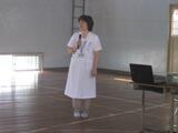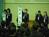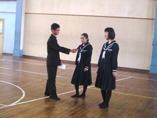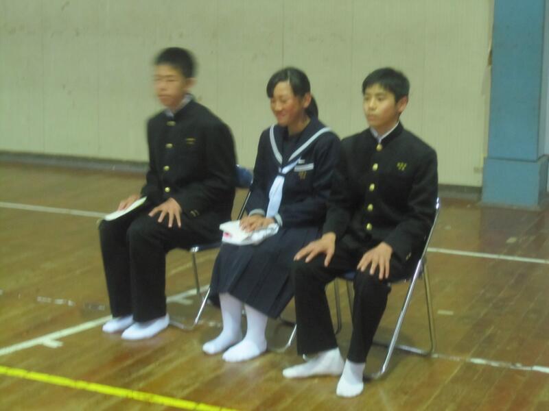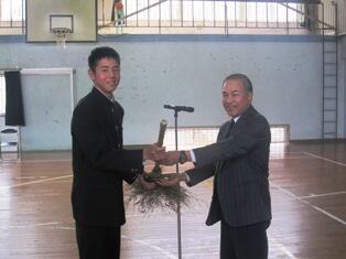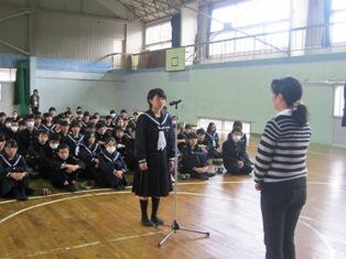 大田原先生(音楽)の勤務が今週いっぱいになりました。集会で生徒会長の田中大和くんがお礼の言葉を述べ、副会長の押領司尚美さんが花束を贈りました。音楽や特別支援学級の授業のみならず、合唱コンクールに向けての指導で大変お世話になりました。