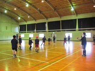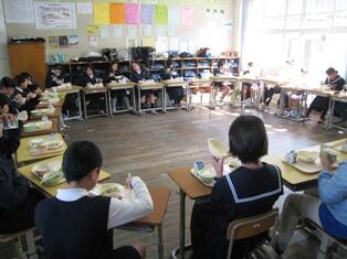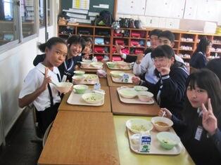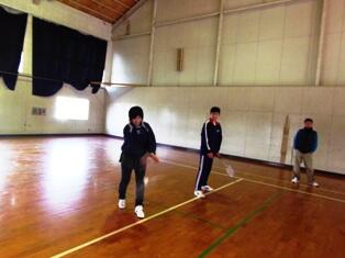 一つの輪になって食べました。 昼休みは中学生と一緒に play tennis