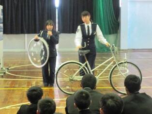 生徒会役員が自力登校を呼びかけました。(写真左)車で送ってもらった人にその理由を聞いているという寸劇です。 (写真右)自力で登校するとこういう力がアップすると説明しています。今年の「学校だより9号」にも書きましたが、10分間、600mくらいは歩きましょう。
