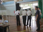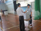 立会演説後、実際の選挙に使われる記載台で、記入し、投票箱へ投票を行いました。