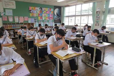 今回は“国語”を実施しました。一週間、朝自習の時間に勉強し、その内容からテストを行います。結果、なんと満点を取った生徒が全校で65人もいました!やった分だけ結果が出るテスト。みんなの努力に拍手です!継続は力なり!!