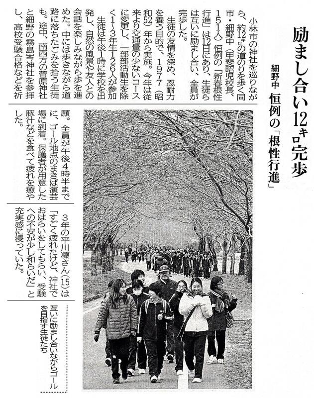 ■ 昭和52年から始まった細野中学校の新春根性行進ですが、平成25年度はコースを変更して、1月12日(日)13:00~実施しました。