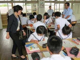 2年に一度の学校訪問です。南部教育事務所と小林市教育委員会から南中道教育推進課長、中屋敷教育長を始め、6名の先生方が来校されました。写真は研究授業、3B国語「挨拶-原爆の写真によせて-」