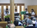地域の介護事業所まきばの園で、敬老の日にちなんで夕涼み会が催されました。ホールもベランダもいっぱいのお客さんの中、吹奏楽部の3年生がお年寄りになじみの曲を中心に10曲ほど演奏しました。いつもお世話になっている地域の皆さんに「音楽で恩返し」です。