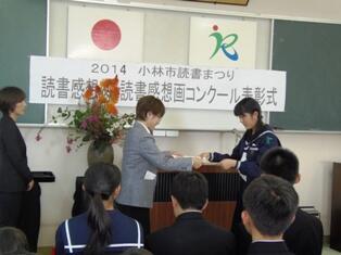 市立図書館で表彰式があり、長田楓香さん(3年)が図書館長賞をいただきました。