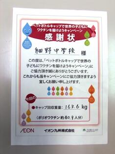 昨年の7月以降、集まったキャップは163.6kg、ポリオワクチン40.9人分でした。記録が残っている平成24年6月からのトータルは、1099.6kg、ワクチン274.75人分になります。