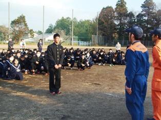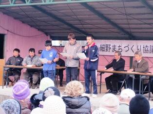 設立宣言、中学生の代表は田中大和くん(生徒会長2年) 後方に見えるのがどんど焼きのやぐらです。