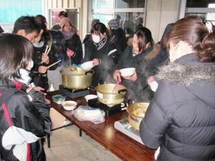 お母さんたち心づくしの豚汁で温まります。みんな何杯もおかわりをしていました。