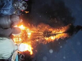 点火直後のやぐらはすごい迫力でした。竹の先にお餅をさして焼いています。