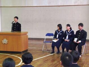 学年と生徒会の代表者による年頭所感発表 小林市社会科コンテスト満点者(3年生)